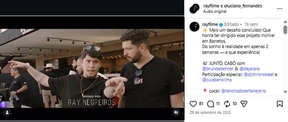 Com mais de 500 projetos musicais realizados entre clipes e DVDs Ray se destaca pela capacidade de unir narrativa visual e emoção, criando conteúdos de alto impacto que dialogam diretamente com o público.